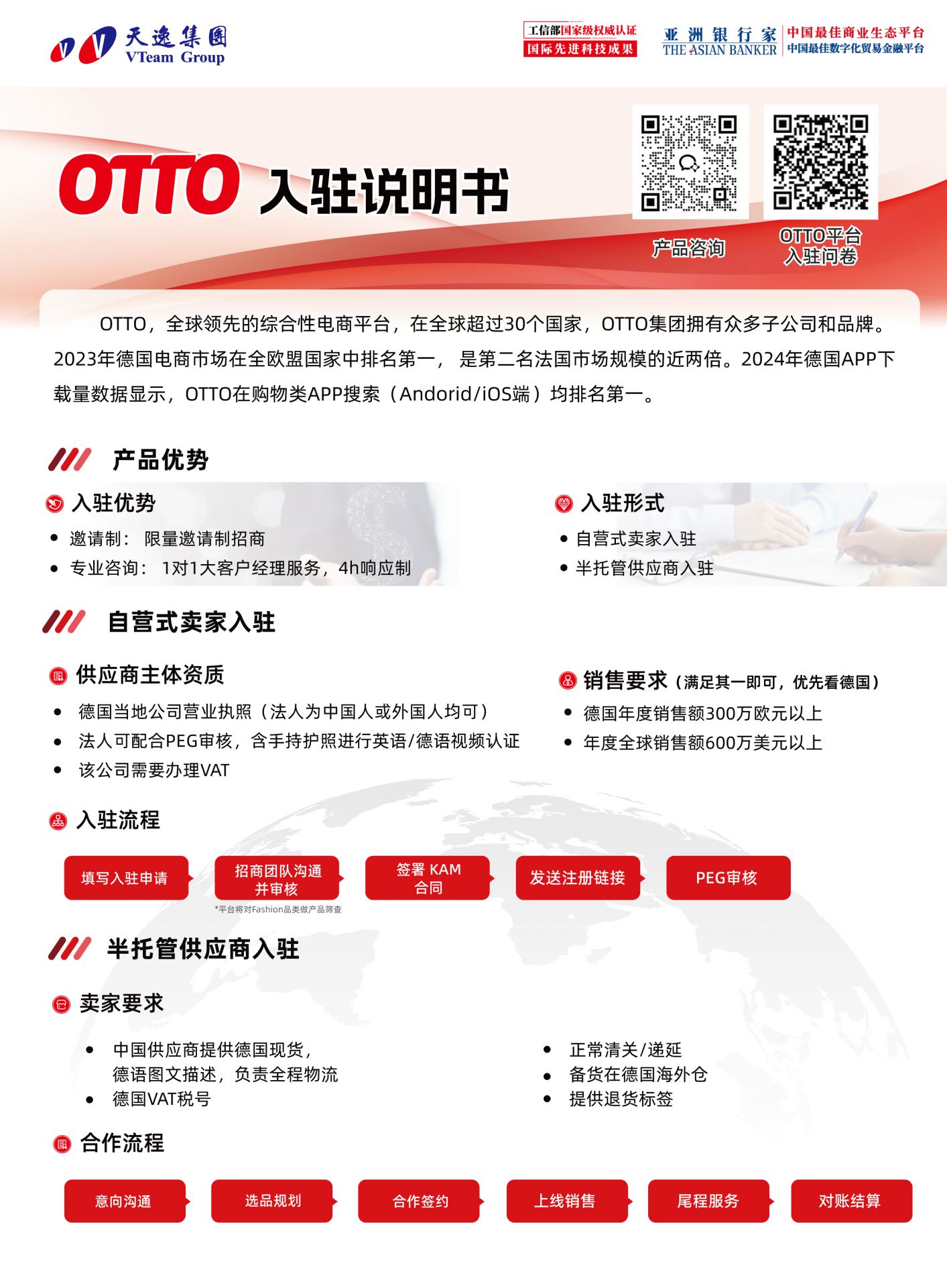 作为连接欧洲市场的重要跨境电商平台,OTTO自进入中国以来,始终秉持严格的卖家入驻标准,并采用限量邀请制的招商模式。天逸集团作为OTTO在中国的优质合作伙伴,不仅能为平台卖家提供“额度上不封顶”的电商融资服务,还可协助符合条件的电商企业入驻OTTO平台,助力卖家抢先拓展欧洲市场!